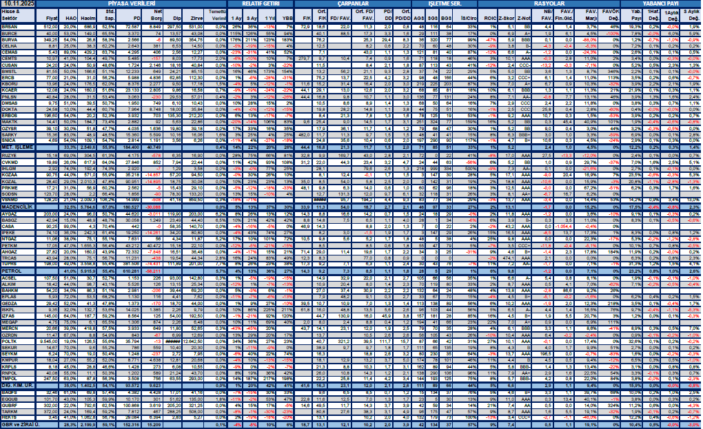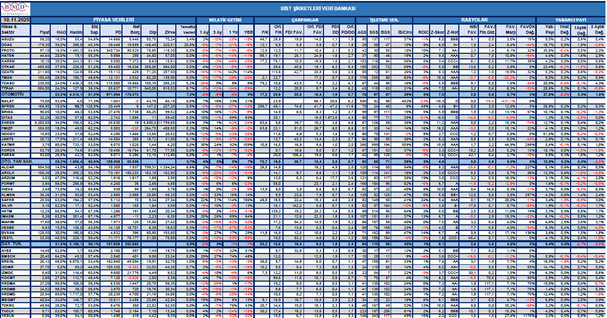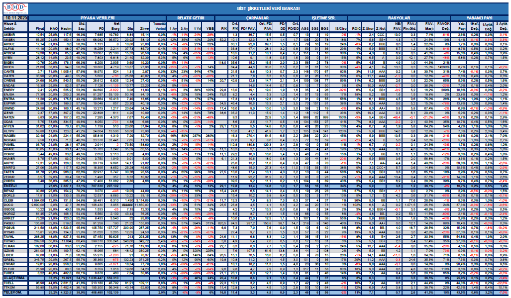 BMD Araştırma’nın raporunda göre, Borsa İstanbul’da işlem gören şirketlerin sektörleri, halka açıklık oranı, ortalama hacim, son bir yıllık dip ve zirve fiyatları gibi piyasa verilerini; BİST 100 endeksine göre göreceli getirilerini; F/K, FD/FAVÖK ve PD/DD çarpanlarının cari ve ortalama değerlerini; alacak stok ve borç gün süreleri ile işletme sermayesi/ciro oranını; ROIC, Z-Skor, Net Borç/FAVÖK gibi rasyoları ve yabancı payı değişimlerini gösteren veri bankası şu şekilde:
